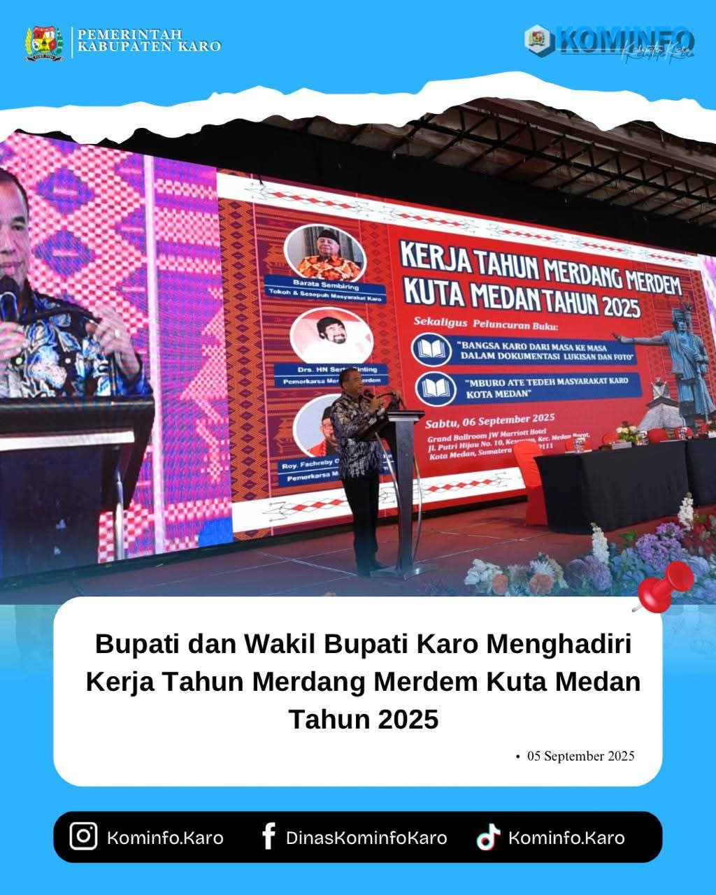 Bupati Karo, Brigjen Pol (Purn) Dr. dr. Antonius Ginting, Sp.OG., M.Kes., dan Wakil Bupati Karo, Komando Tarigan, S.P., Menghadiri Kerja Tahun Merdang Merdem Kuta Medan Tahun 2025 yang berlangsung sangat meriah di Grand Ballroom JW Marriott Hotel Medan, Sabtu (06/09/2025).
