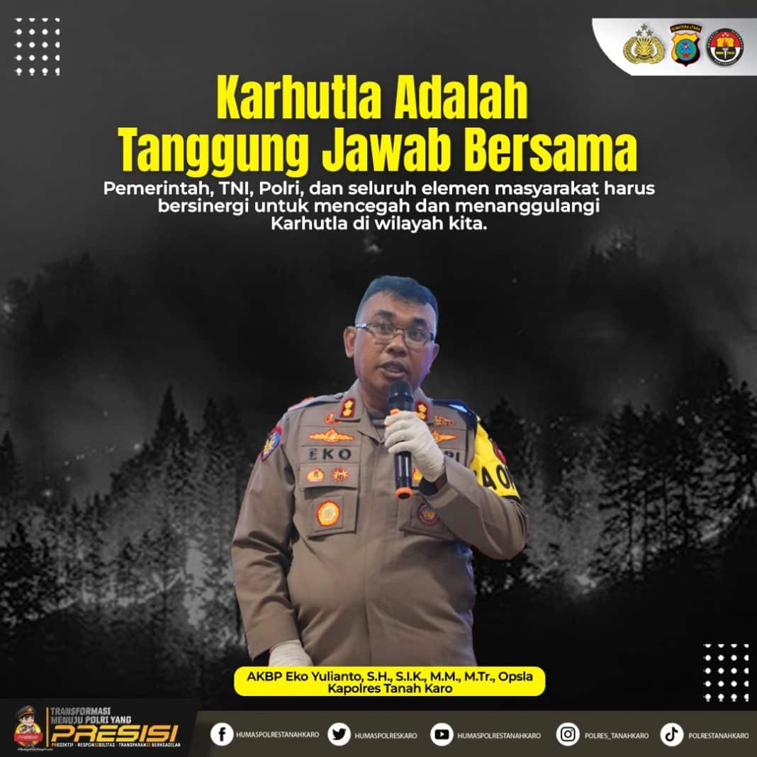 Menyikapi ancaman kebakaran hutan dan lahan (karhutla) yang terus menghantui sejumlah wilayah, Kapolres Tanah Karo AKBP Eko Yulianto, S.H., S.I.K., M.M., M.Tr.Opsla mengimbau seluruh elemen masyarakat untuk meningkatkan kepedulian dan tanggung jawab bersama dalam mencegah terjadinya karhutla.