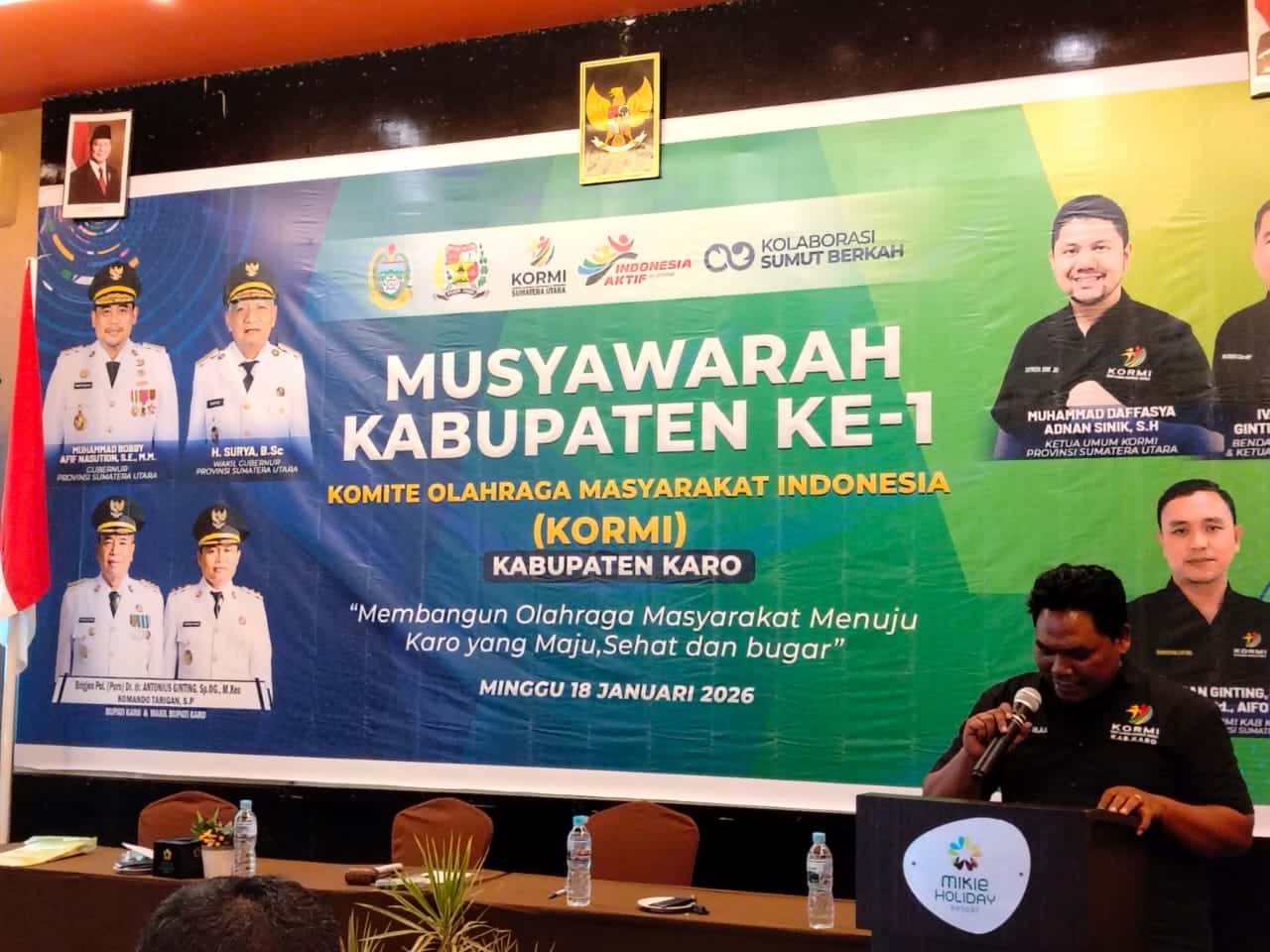 Berastagi – Ketua umum KORMI Sumut ( Komite Olahraga Masyarakat Indonesia) “Muhammad Daffasya Adnan Sinik, S.H” secara resmi membuka musyawarah pembentukan pengurus Komite Olahraga Masyarakat Indonesia (KORMI) untuk Kabupaten Karo periode Tahun 2026 – 2030 di salah satu Hotel Mickey Holiday Berastagi. Minggu (18/1/2026).