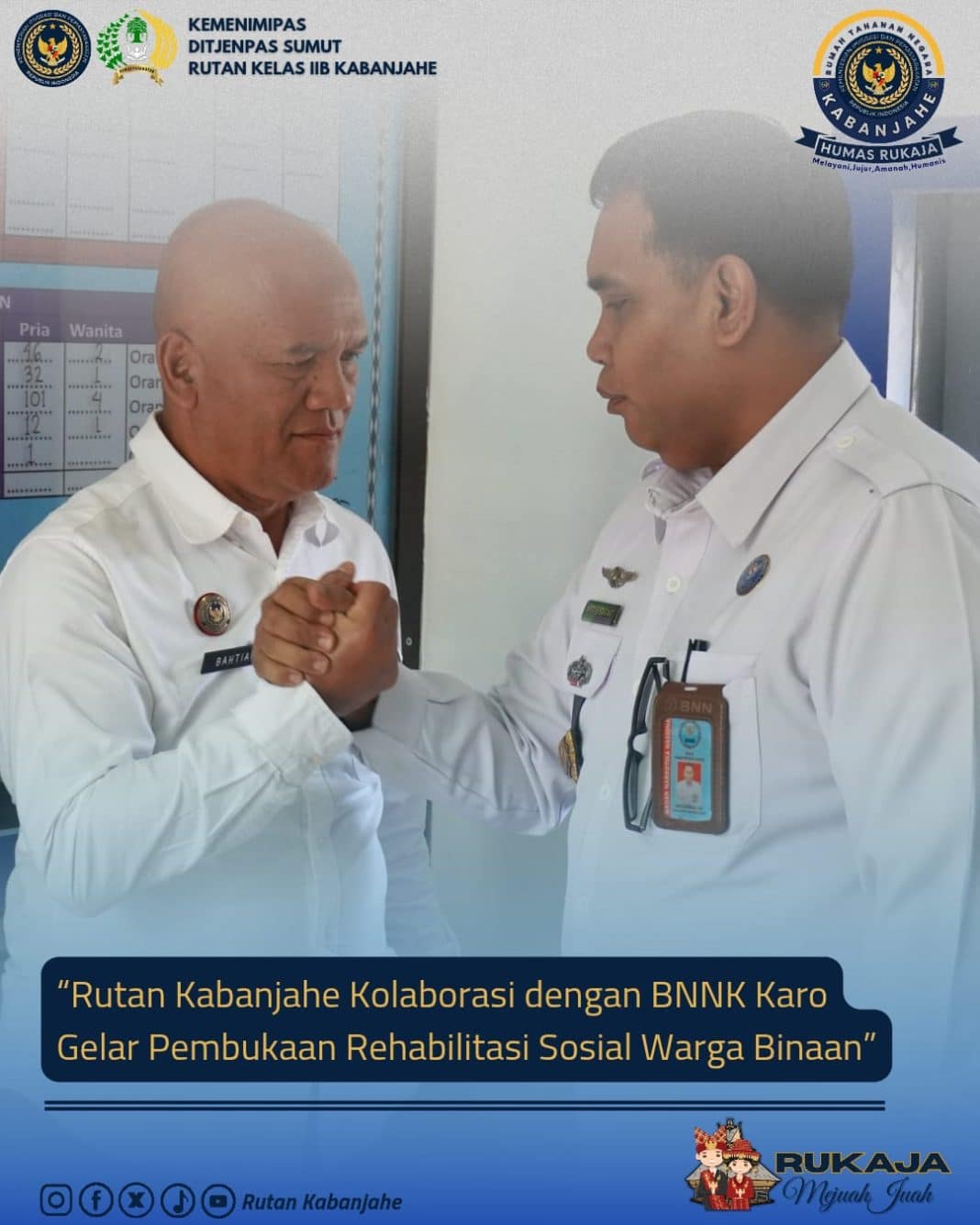 Kabanjahe, 13 Agustus 2025 — Rumah Tahanan Negara (Rutan) Kelas IIB Kabanjahe bersama Badan Narkotika Nasional Kabupaten (BNNK) Karo secara resmi membuka program Rehabilitasi Sosial bagi warga binaan pemasyarakatan, Rabu (13/8/2025) Pukul 10.00 WIB. Kegiatan ini merupakan bentuk sinergi antar instansi dalam upaya penanggulangan penyalahgunaan narkotika di lingkungan lembaga pemasyarakatan.IMG 20250813 WA0114