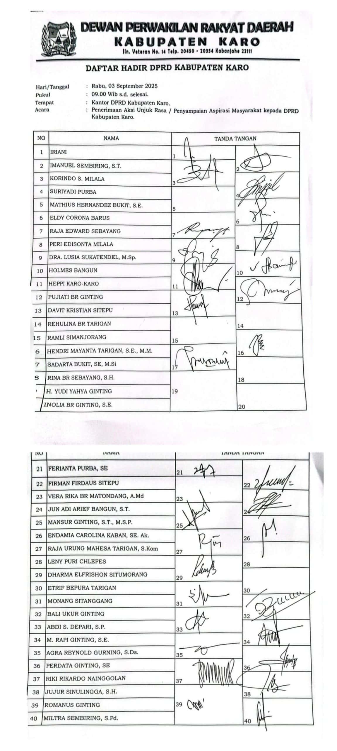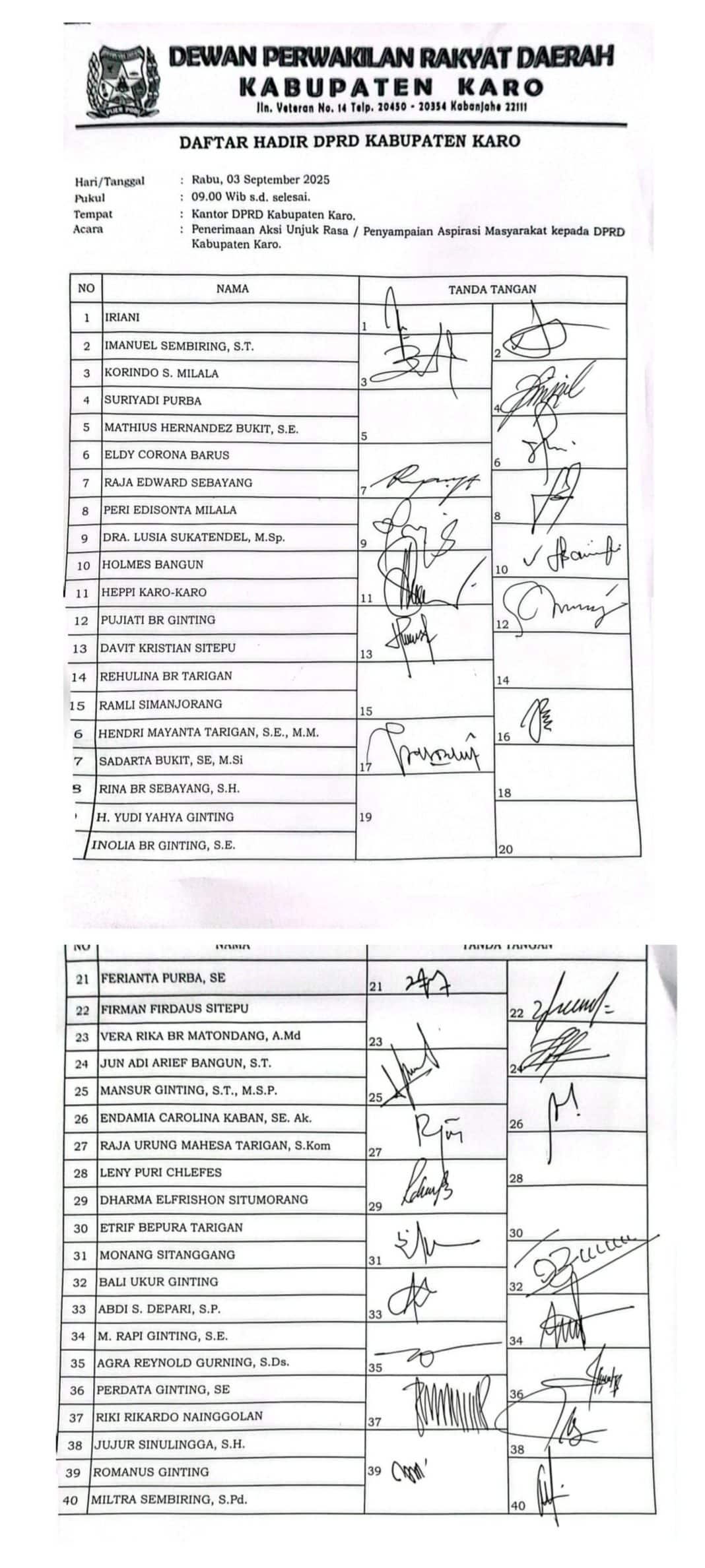 Dihadapan Ketua DPRD Kabupaten Karo dan jajaran Forkopimda, Massa aksi meminta agar DPRD Karo dapat serius dalam bekerja, berdasarkan dokumen daftar hadir yang diserahkan Sekwan, total 40 kursi anggota DPRD Karo saat ini , 32 anggota tampak hadir menjadi penyambung aspirasi masyarakat Kabupaten Karo, namun sangat disesali oleh massa aksi , ada 8 orang anggota DPRD Karo lagi yang tidak hadir dan tak tau dimana rimbanya, hendaknya menjadi catatan oleh masyarakat dan BK Dewan.
